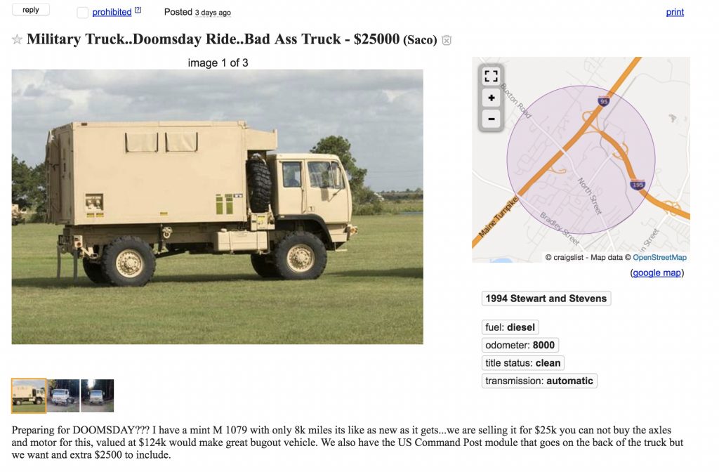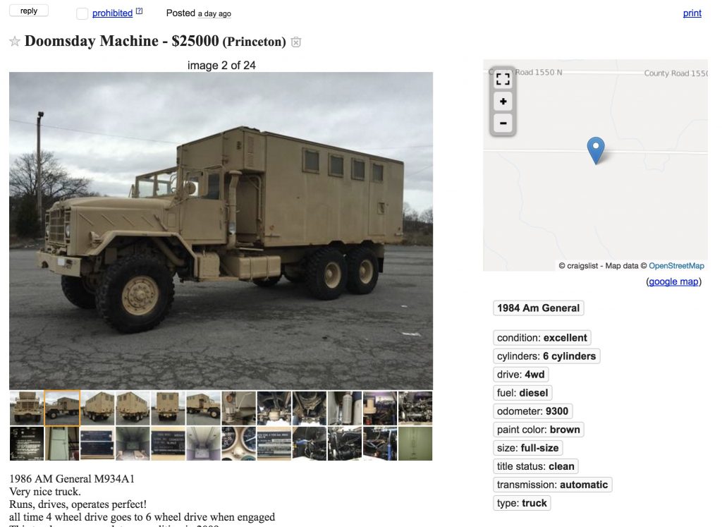 If you want to review all your options before committing, a seller in Louisville has his own “Military Truck…Doomsday Ride” for sale right now too, for the same price of $25,000.